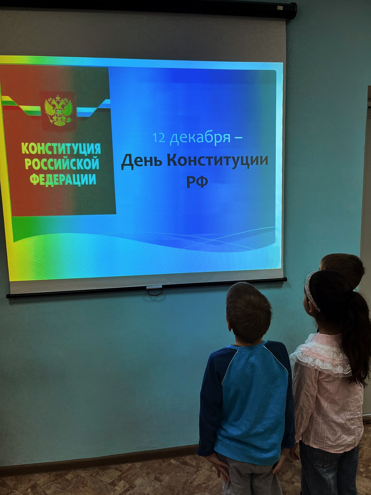 В День Конституции РФ, в старших и подготовительных группах прошли различные мероприятия. Воспитанники познакомились с понятием «закон», «порядок», «право», повторили государственную символику: флаг, герб. Для детей организовали просмотр видеопрезентации «Конституция — основной закон страны».