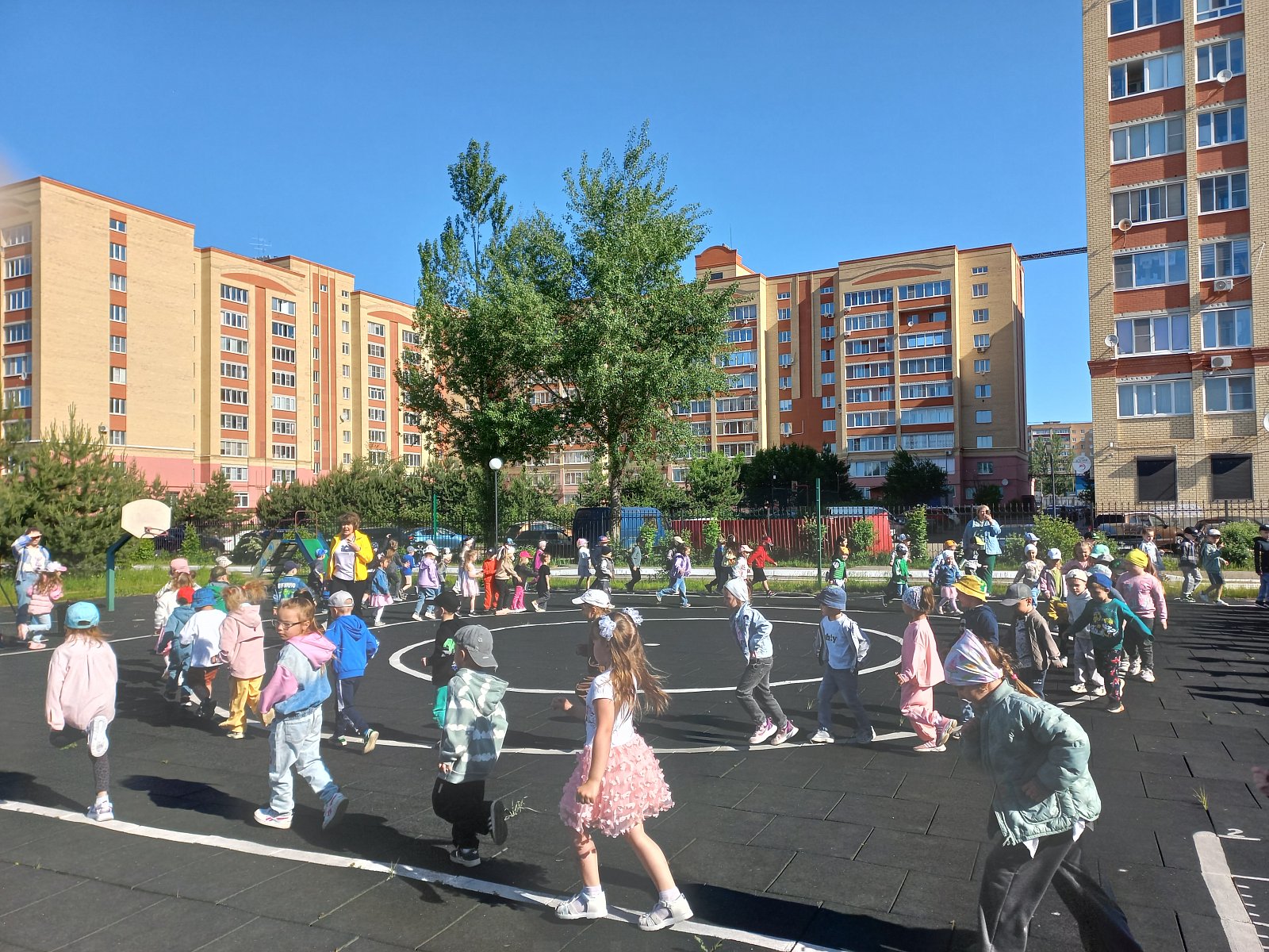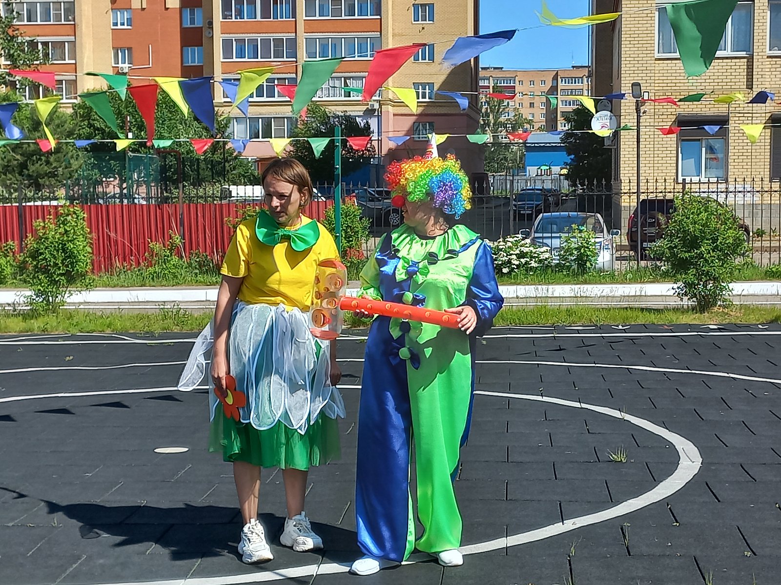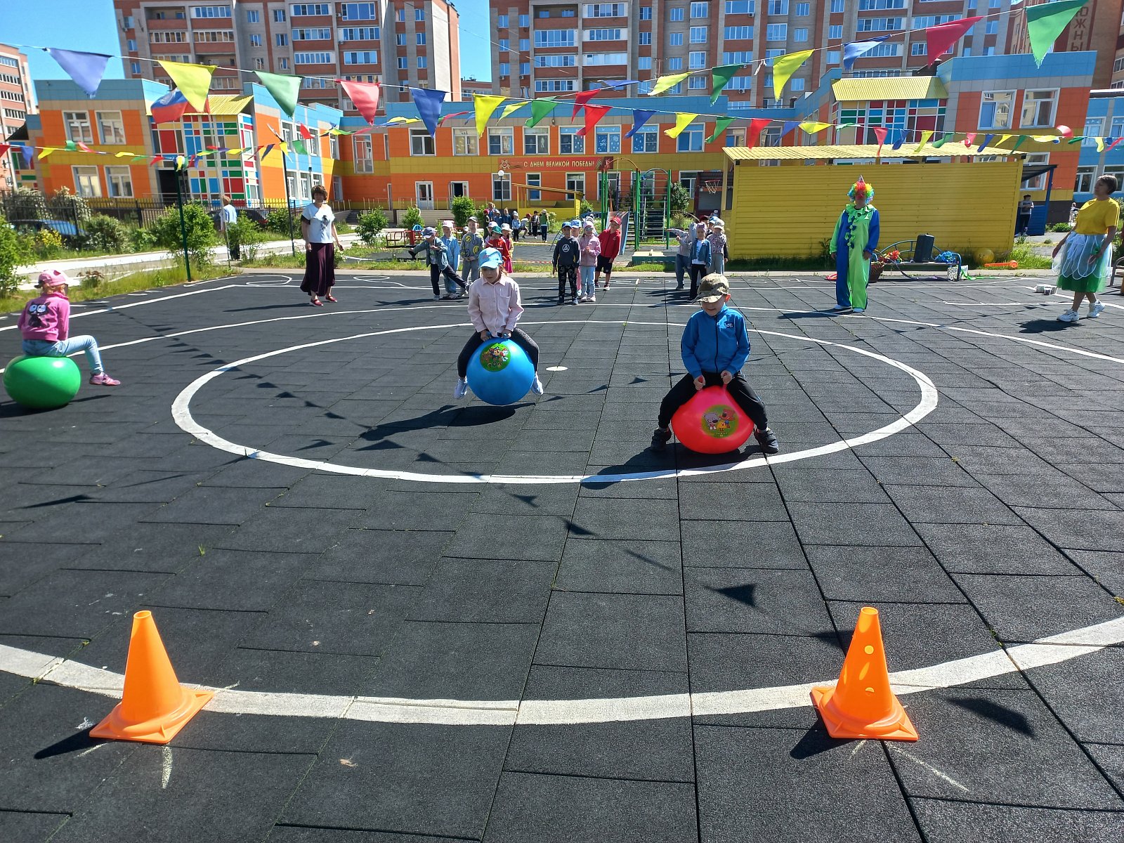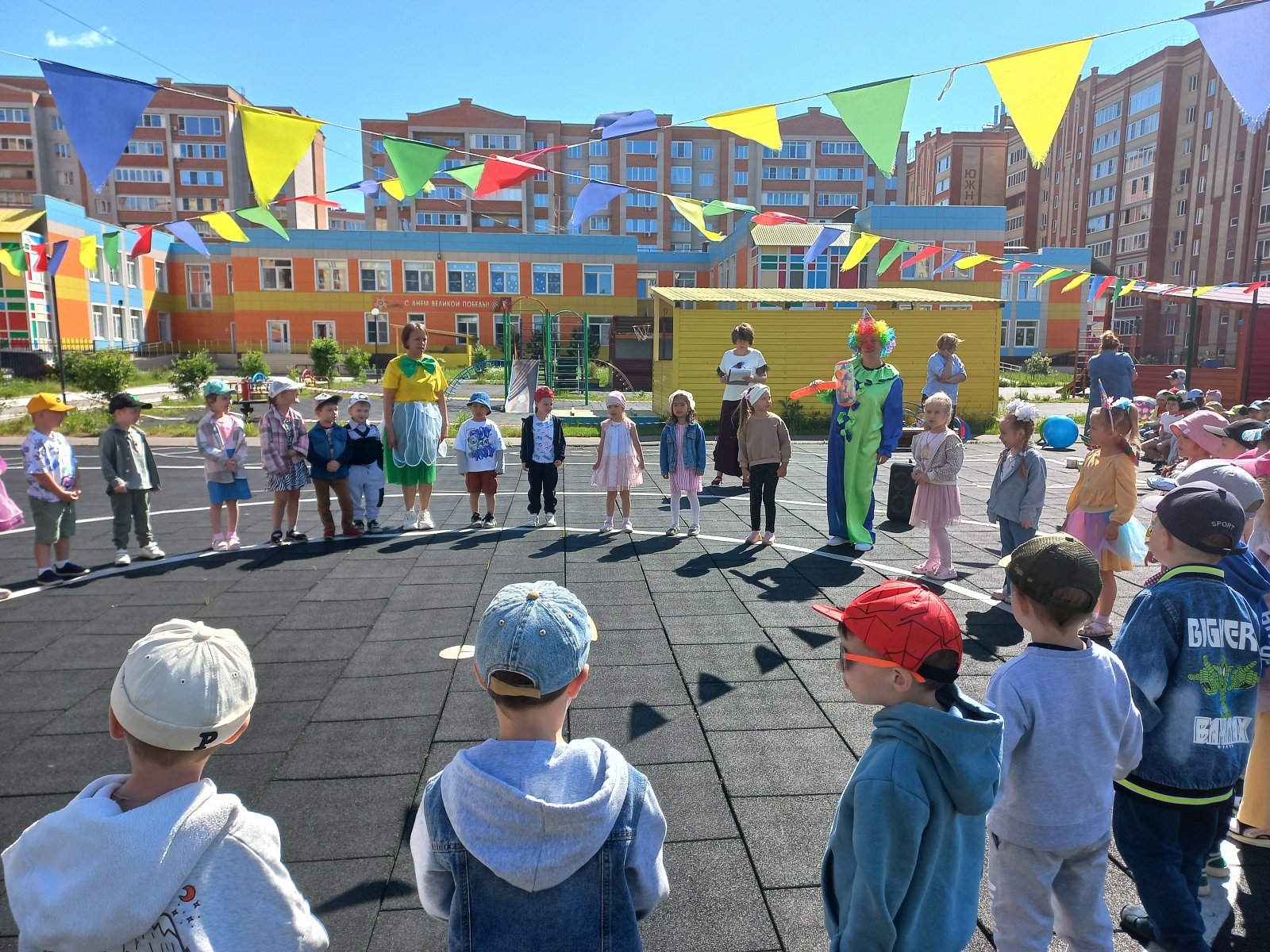 Радостно, звонко, тепло и красочно прошёл главный праздник детств в нашем детском саду. Все педагоги старались сделать так, чтобы этот праздник надолго запомнился детям. В гости к ребятам пришли - Ириска и Клоун. Герои восхищались тем, как поют и танцуют дети и, конечно, много играли с ними, водили хороводы и подарили детям хорошее настроение. Было приятно видеть радостные детские лица и слышать весёлый детский смех. Дети запускали мыльные пузыри и праздник продолжился рисованием на асфальте цветными мелками .